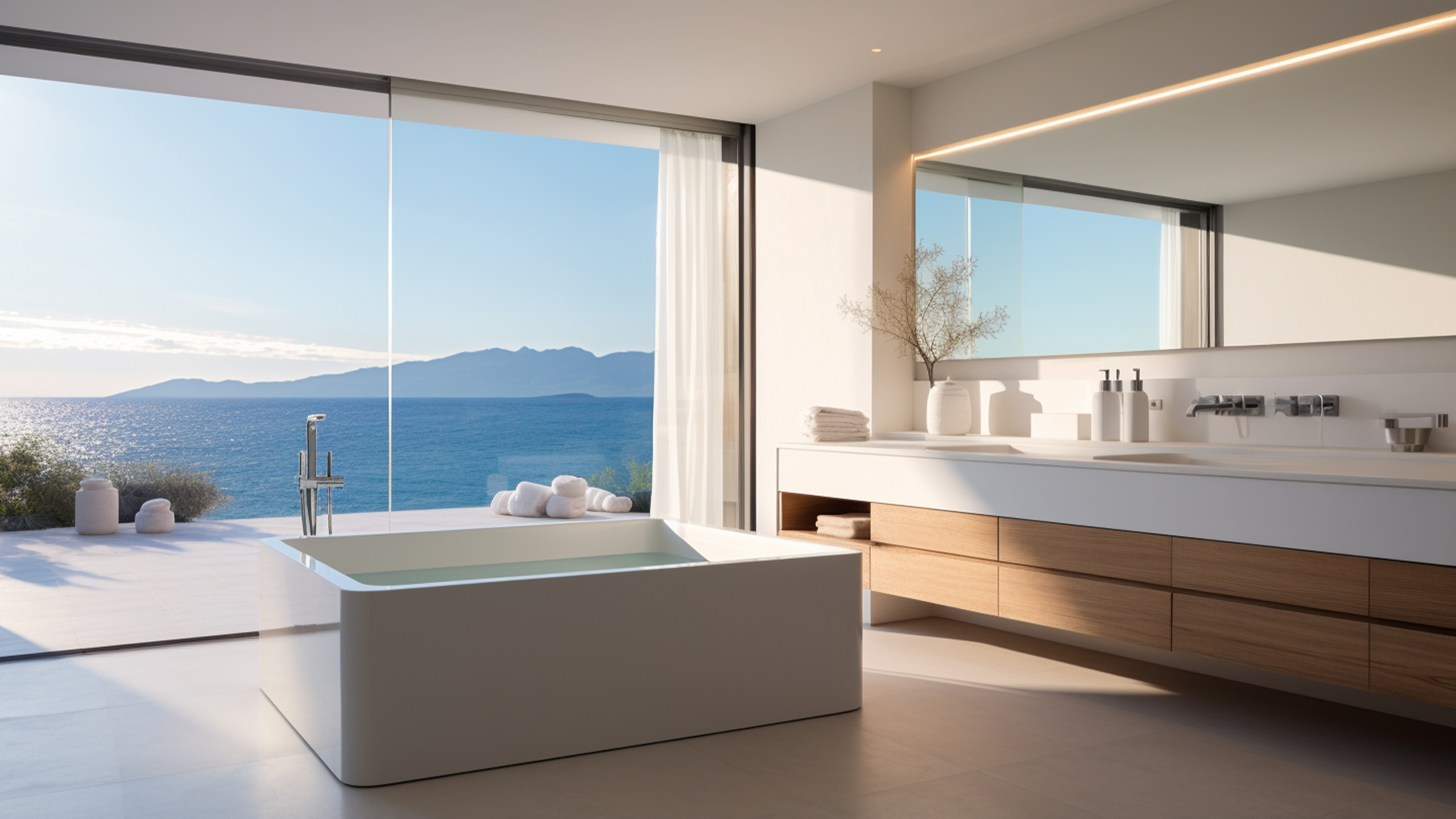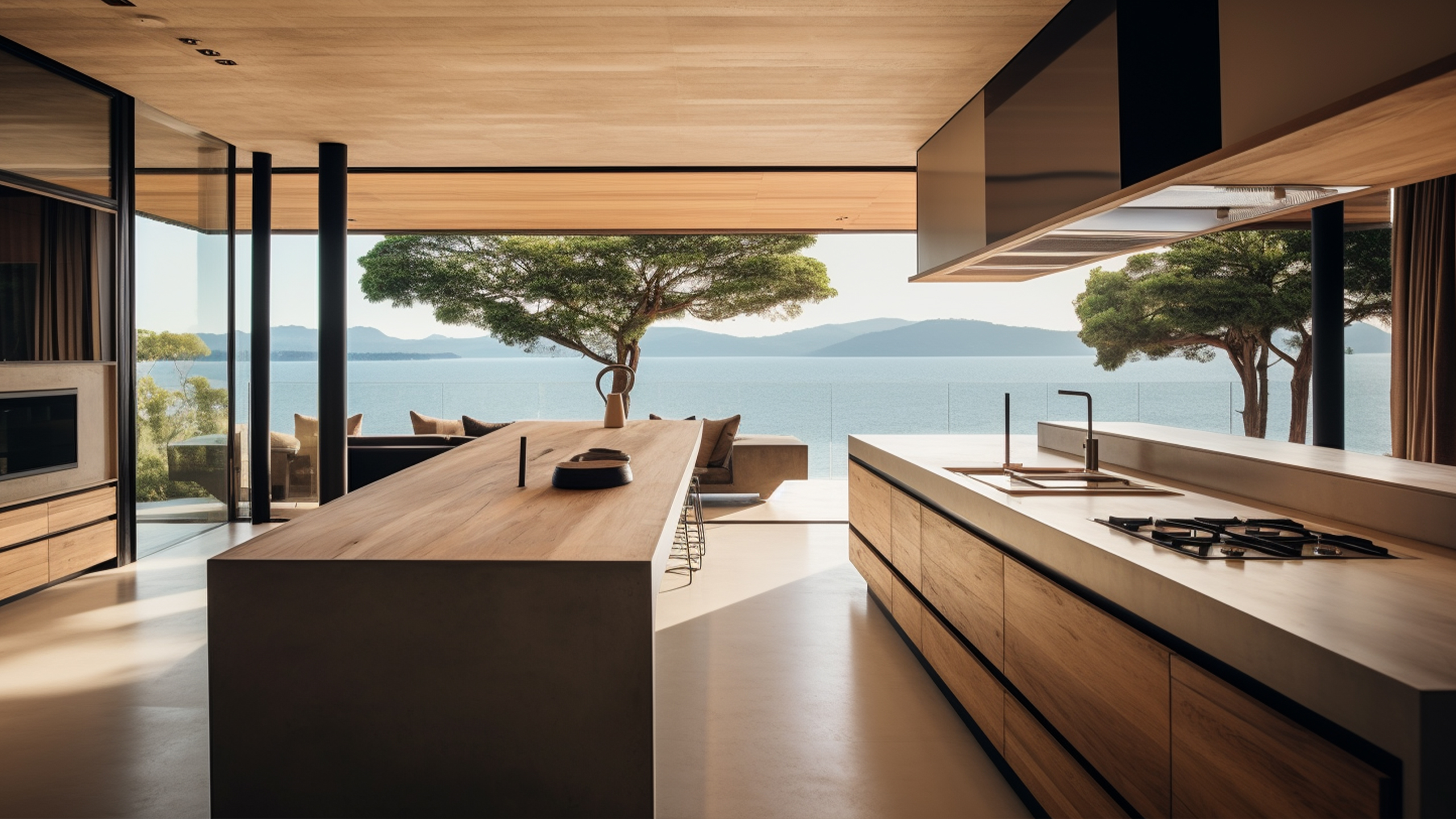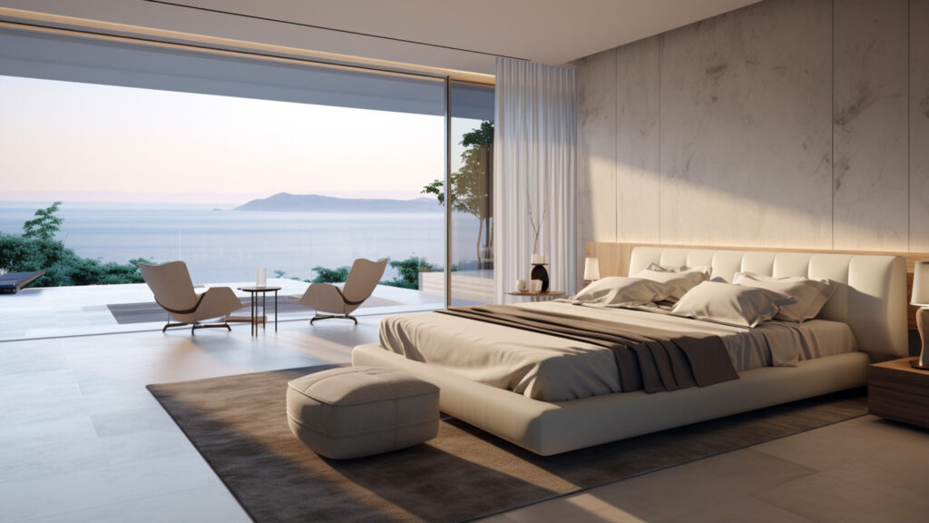 Ground floor: open-plan kitchen with island connected to the living area, plus a separate dining room. The living space is divided into two zones – TV area and dining area – along with a guest toilet. Floor-to-ceiling sliding glass windows open the entire lounge to the terrace, blending indoors and outdoors seamlessly. Glass railings preserve uninterrupted sea views from every corner. A guest bedroom is also located on this level.